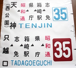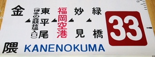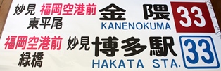 そもそもは、博多駅〜空港〜月隈団地〜志免〜須恵・宇美を結ぶ路線でした。 それが1990年代半ば「ブラウン大作戦(宇美方面パターンダイヤ化)」前後には、「タワー〜都市高〜呉服町〜博多駅〜空港〜月隈団地〜志免〜新原」と運行区間変更と本数削減が行われます。 写真のは、タワー直通運行時代の末期に使用されていた幕。博多駅を境に、方向幕が変わります。