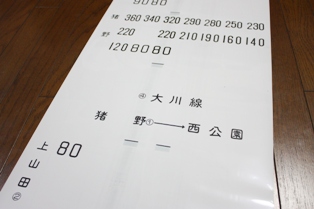 初乗りは80円! 以前入手していた、料金表のアクリル板に、ピタリと合う大きさでした。 (上でご紹介した那珂川や鳥栖の運賃幕は、これよりも一回り幅があります) 7×3の21コマバージョン。記憶が蘇る感動ものです。 |