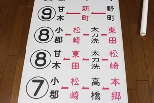 このように、手持ちの幕のカラーは全部で6色。 経由地行き先は「角ゴシック」ですが、行き先番号だけ「丸系フォント」が使われているハイブリット仕様! 雑餉隈営業所での販売で1本だけ、久留米の販売会で数本が見つかりました。 |