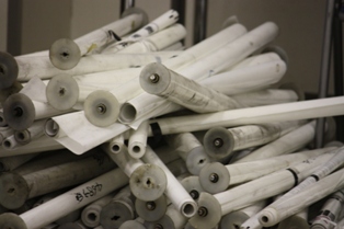床の間に並べられ、整備を待つ方向幕の巻物達。