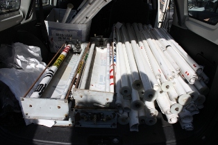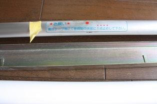 (右)幕を装着中。下からくぐらせて、上の芯棒に取り付ける途中です。 |