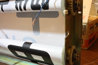 (左)上の芯棒に固定しました。あとは残りの部分を手動スイッチで巻き取っていくだけ。
