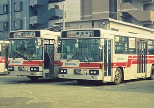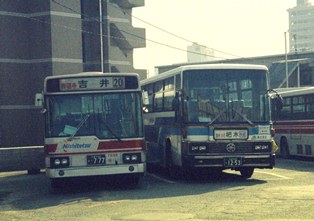 (上)2000年過ぎ、その吉井高速車も廃車となります。しばらく金武営業所の隅にズラリと整列して最後の時を待っていました。 |