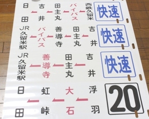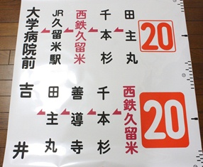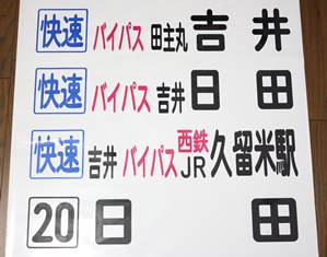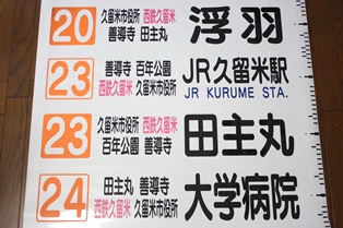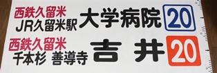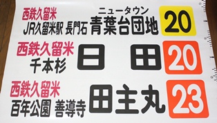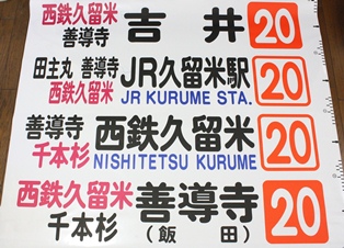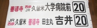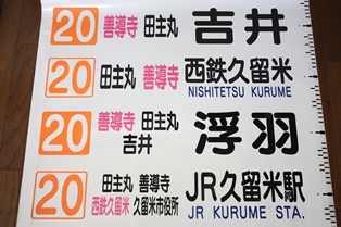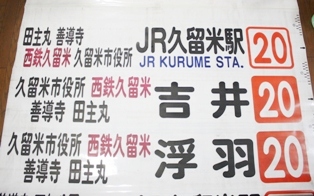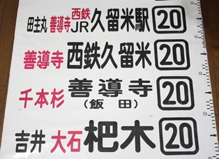 (左)大型路線車の幕です。国道210号線の一本道を東西に行き来するシンプルな路線だけに、表記も簡潔です。JR久留米駅行きの、JRとの二段書きは独特です。 (右)久留米発の幕。20番の飯田行きも少数ありました。 |