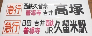 (左)前幕。終点に加え始発もデカ文字で書く・急行区間を書くなど、この表記は西鉄の中でもこの系統だけではないでしょうか。 (右)経由地に「林田」が入るタイプの前幕です。